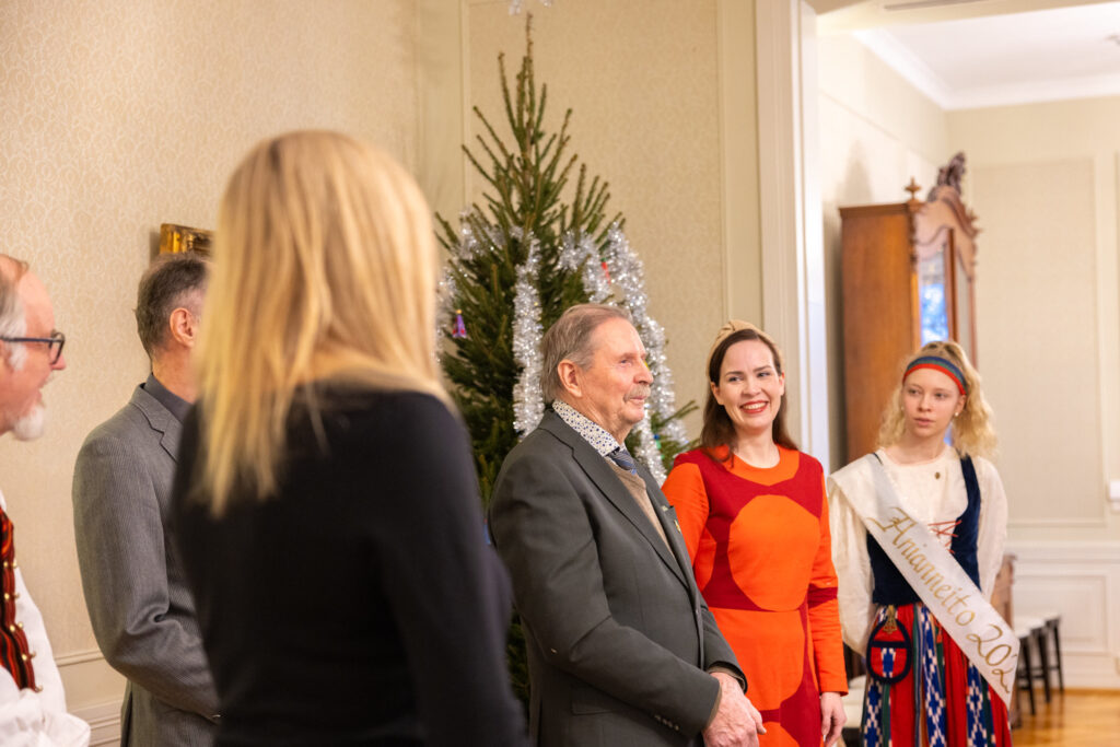 Kuvassa keskellä pääministeri Petteri Orpo (Kok.) ja hänen puolisonsa Niina Kanniainen-Orpo. Eturivissä vasemmalta toisena kuusidelegaation johtaja, metsätalousneuvos Matti Mäkiaho.Pääministerin oikealla puolella Asikkalan kunnanhallituksen puheenjohtaja, kansanedustaja Hilkka Kemppi (Kesk.). Oikealta Meton puheenjohtaja Stefan Borgman, METO Häme-Uusimaan puheenjohtaja Markus Niemelä sekä joulukuusen kasvattaneen ja toimittaneen Rajajärven kuusifarmin edustaja Jimi Rajajärvi. Kuva: © Katja Säilä, valtioneuvoston kanslia