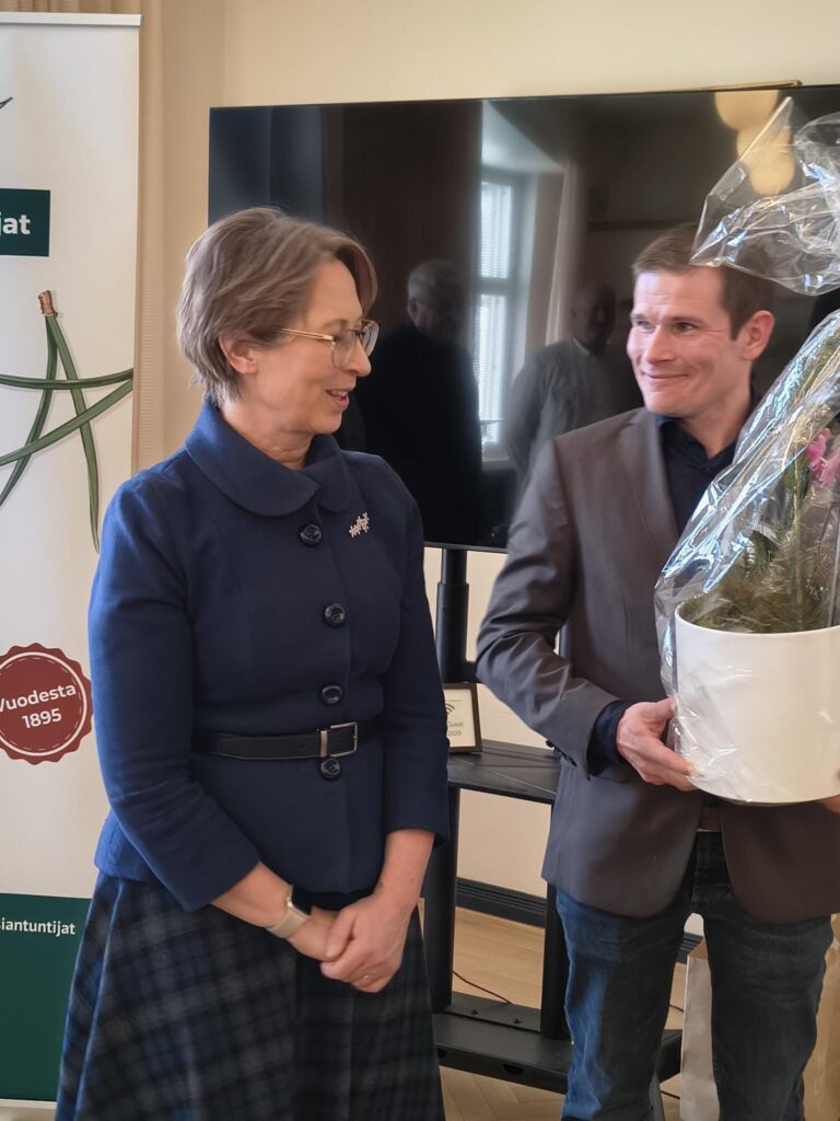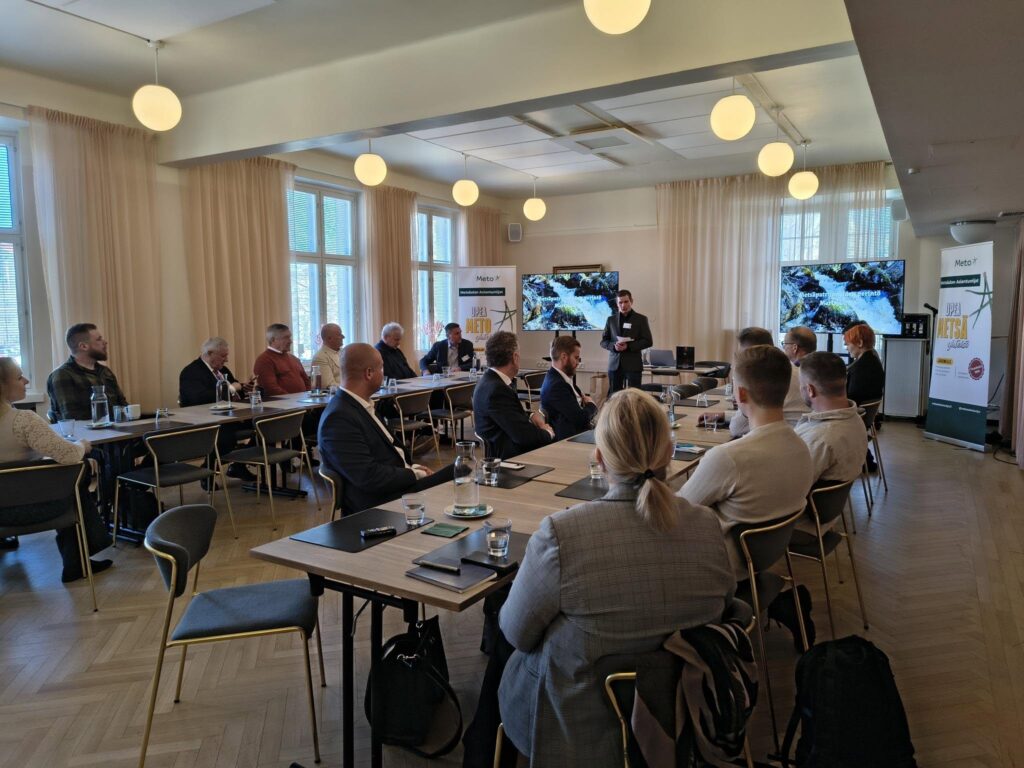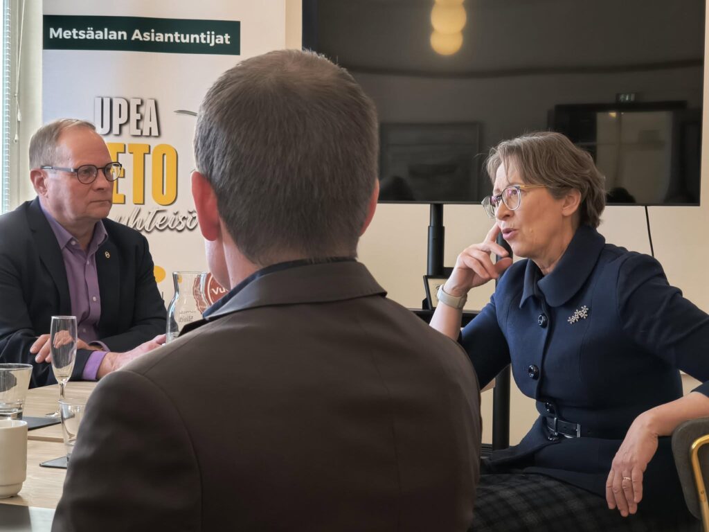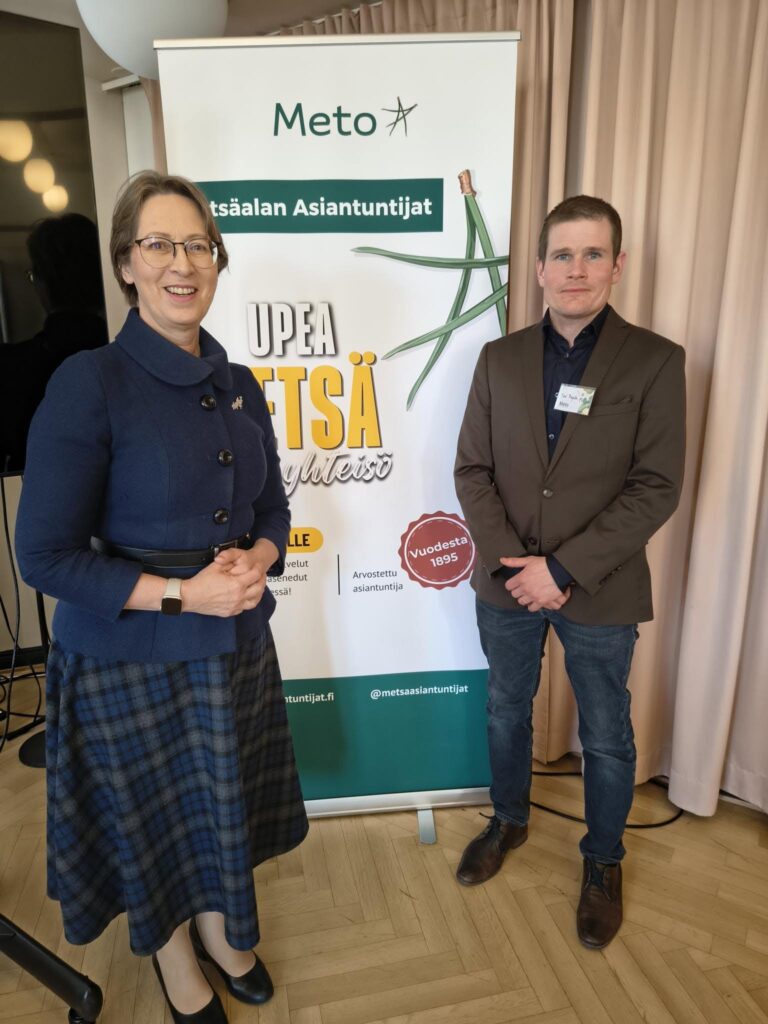 Maa- ja metsätalousministeri Sari Essayah toi ministeriön onnittelut 30-vuotisjuhliaan viettävälle vireälle yrittäjäyhdistykselle. Hän kertoi ajankohtaisista metsä- ja luonnonvara-alan asioista. Ministerin vieressä METO – Metsäalan Yrittäjät ry:n puheenjohtaja Toni Pajula.